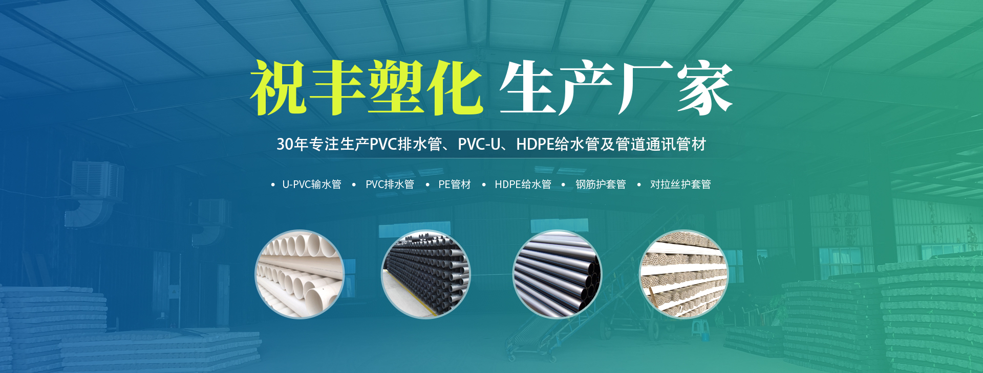 安陽(yáng)市祝豐塑化有限公司坐落在滑縣工業(yè)園區(qū),東臨大廣高速,西臨京珠高速,是鄭州、鶴壁、安陽(yáng)、濮陽(yáng)四個(gè)城市的輸紐,交通便利、環(huán)境優(yōu)美。 公司始建于八十年代,經(jīng)過(guò)二十余年的艱辛創(chuàng)業(yè),規(guī)模不斷壯大,由十多萬(wàn)元資產(chǎn)的小廠(chǎng),發(fā)展到現(xiàn)占地面積達(dá)一萬(wàn)多平,建筑面積一萬(wàn)平,資產(chǎn)2000多萬(wàn)元管材生產(chǎn)企業(yè)。公司生產(chǎn)PVC-U、PVC排水管、HDPE給水管、鋼筋護(hù)套管管道通訊管材等產(chǎn)品,廣泛用于農(nóng)田節(jié)水、高山引水、人畜用水、建筑、電力通訊等多種用途,品種齊全。為了滿(mǎn)足用戶(hù)需求,可承攬各種給水、節(jié)水、灌溉工程。“祝豐塑化”憑借強(qiáng)勁的實(shí)力,優(yōu)良的管理水平?!耙再|(zhì)量求生存,以信譽(yù)求發(fā)展”的原則全力以赴和大家共同塑造美好未來(lái)。..